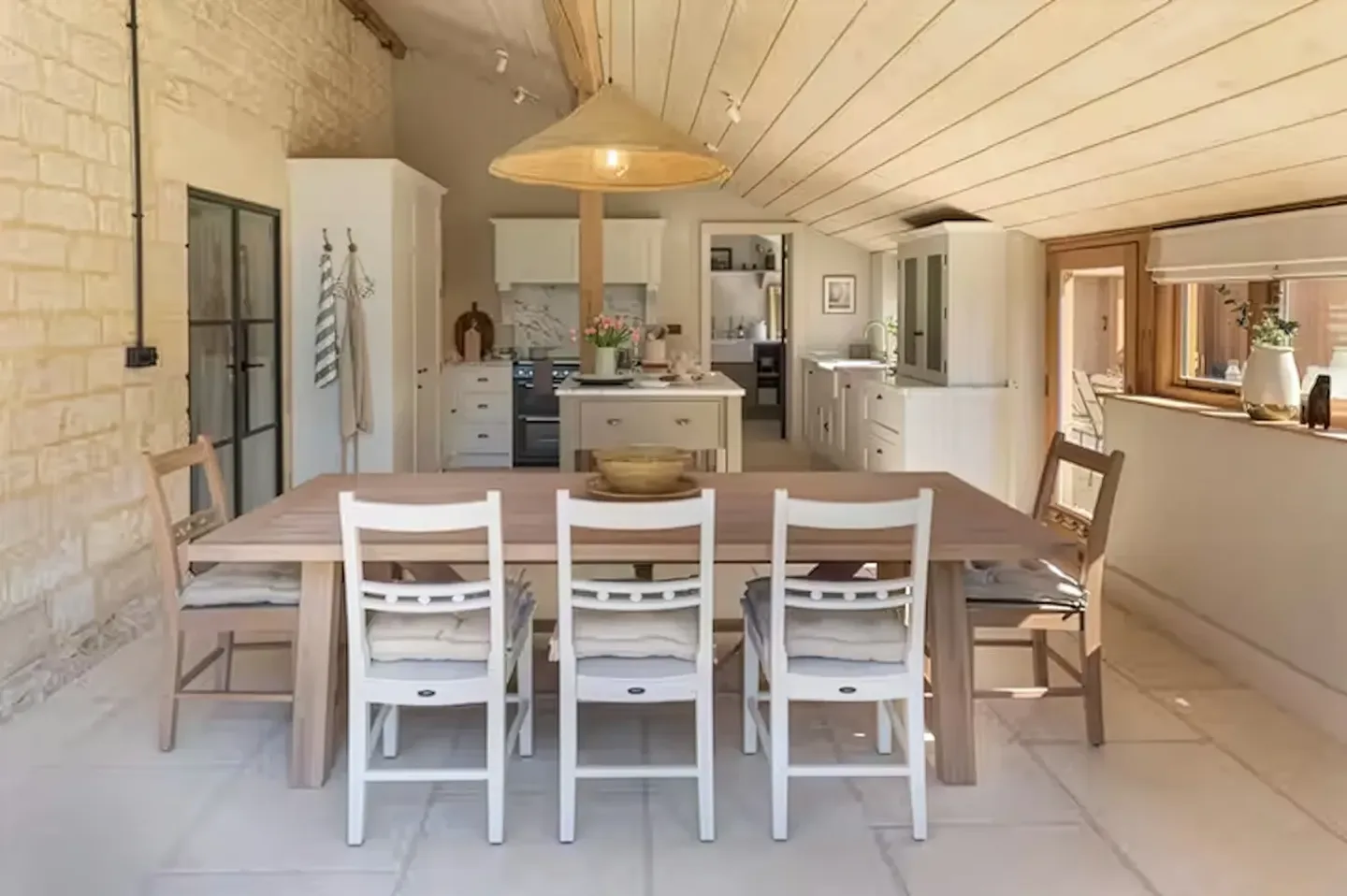 open-plan kitchen is fully equipped for preparing anything from quick breakfasts to hearty dinners, with a dining area that flows directly into an enclosed garden – ideal for both indoor and outdoor entertaining.