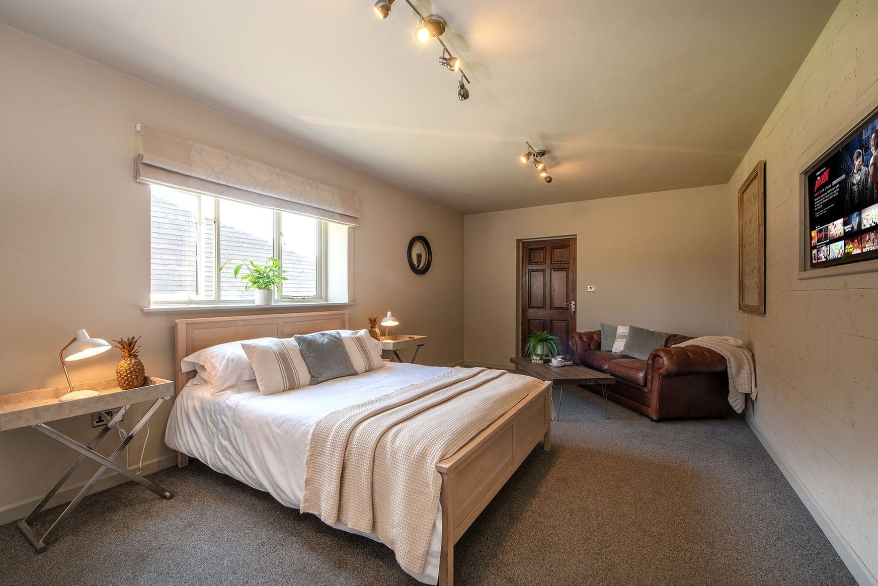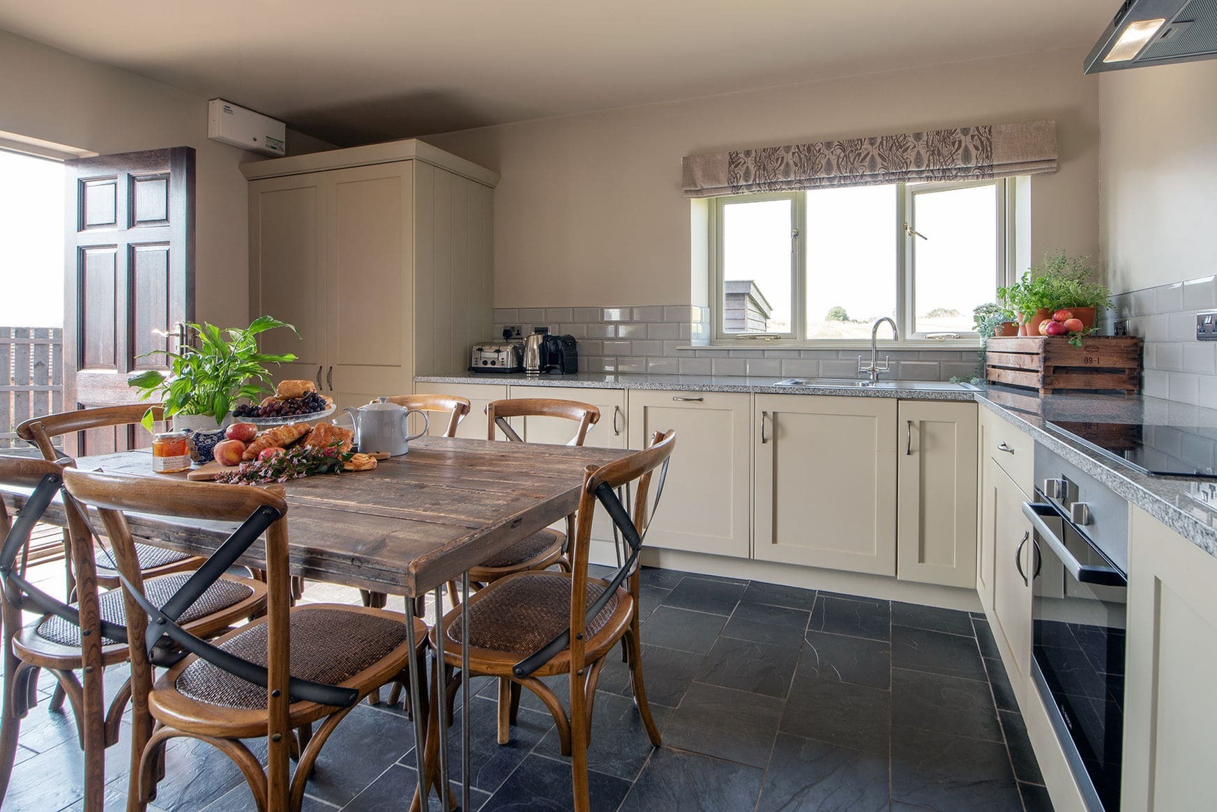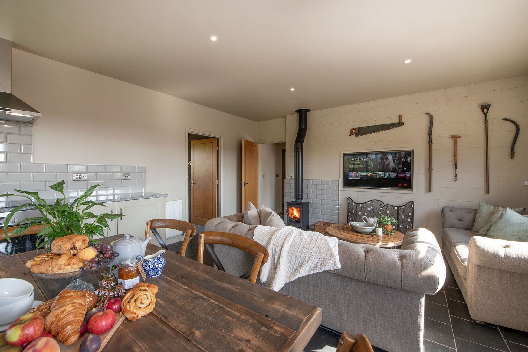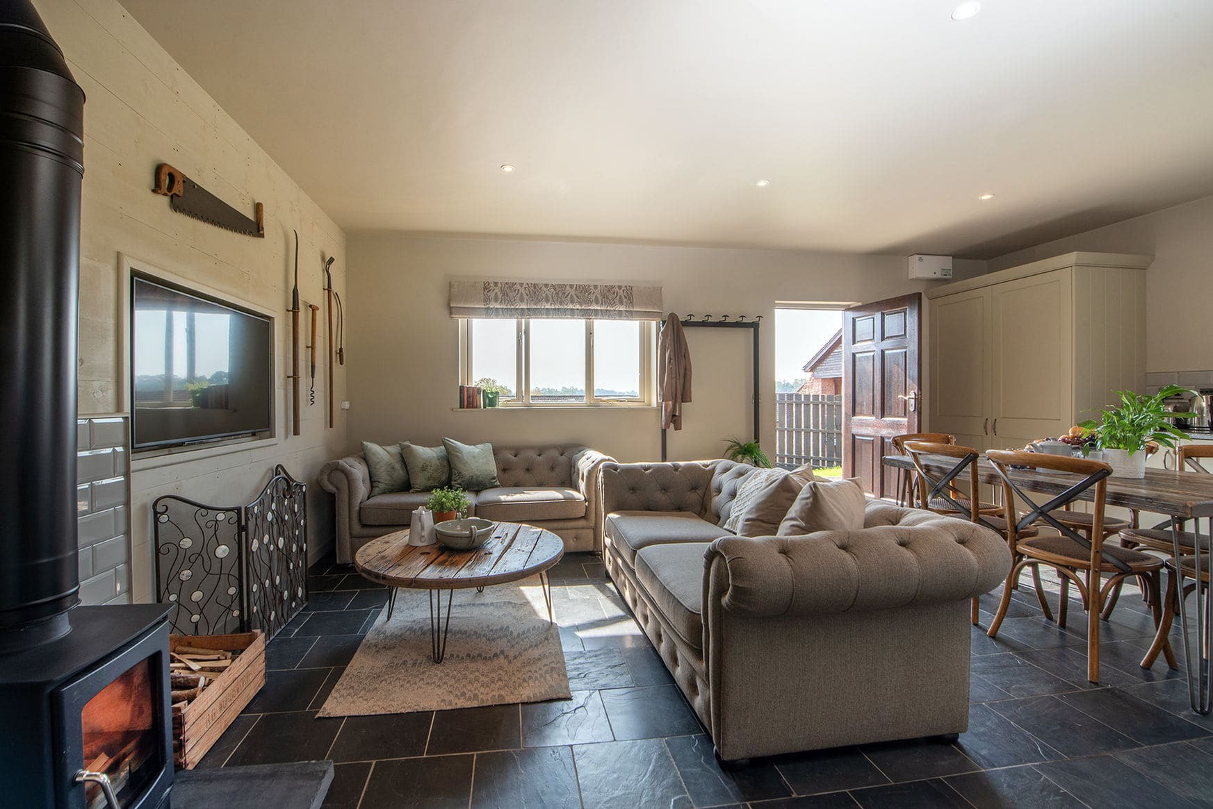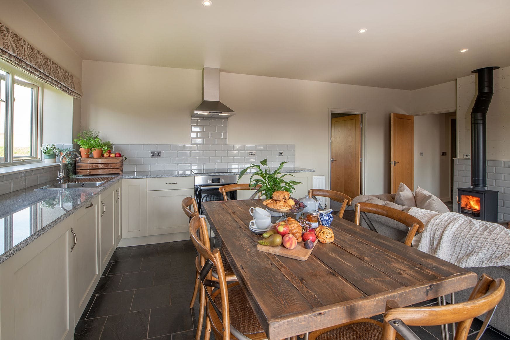 The barn offers one main open-plan living space designed for comfort and ease, with relaxed seating and a log burner as the focal point. The layout suits quiet evenings, shared meals, and time spent unwinding after days outdoors.