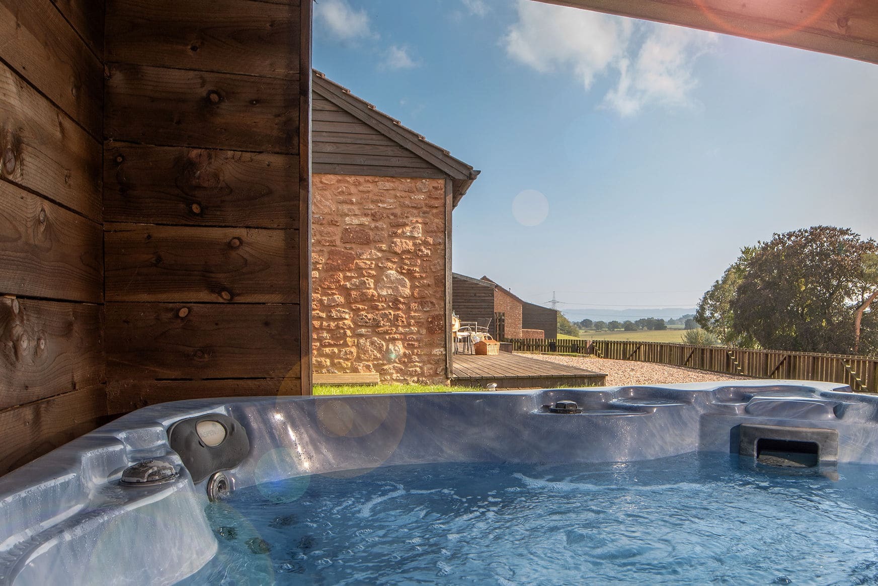Outdoor areas include a private decked area, garden, outdoor seating, and barbecue area. A private hot tub is available for guest use, and a fire pit can be provided on request.